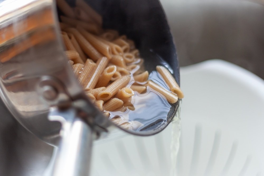 - Cook the pasta in well-salted water until al dente. Reserve some pasta water, then drain.